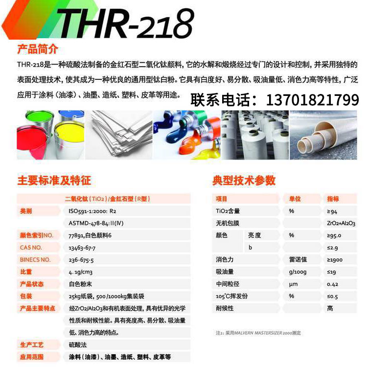 【产品简介】1、粒度 攀枝花钛海钛白粉THR-218通过精心设计水解工艺,使产品具有更细的粒径,从而拥有更洁白的色泽,偏蓝色的底相,更高的遮盖力。2、粒度分布 攀枝花钛海钛白粉THR-218二氧化钛(TiO2)/金红石型(R型)严格控制水解煅烧工艺,使产品粒度分布更加集中,赋予产品更高的光泽,良好的分散,优异的遮盖力,着色力。3、表面处理 独特的铝、锆表面处理技术,使攀枝花钛海钛白粉THR-218能提供较好的光学性能。在表面处理中采用锆化合物,可以达到更高的遮盖力,光泽和光泽保留率,并使产品具有良好的耐候性。 加入有机处理剂包覆THR-218表面,极大的提高了产品的易分散性,使THR-218与水基及溶剂基体更加相容。4、主要标准及特性 (1)攀枝花钛海钛白粉THR-218应用领域:内墙涂料、塑料、色母粒、橡胶、陶瓷釉料、化妆品等。